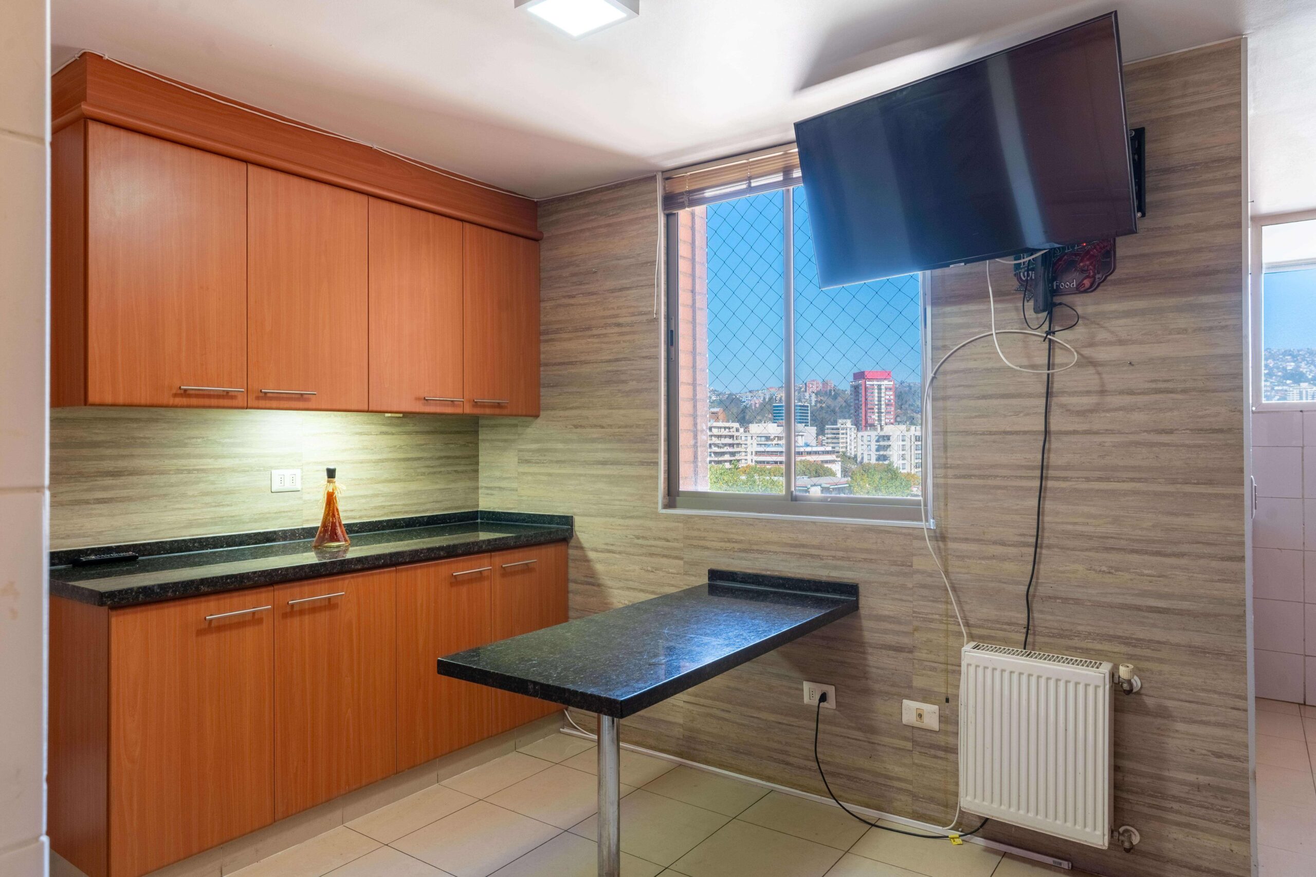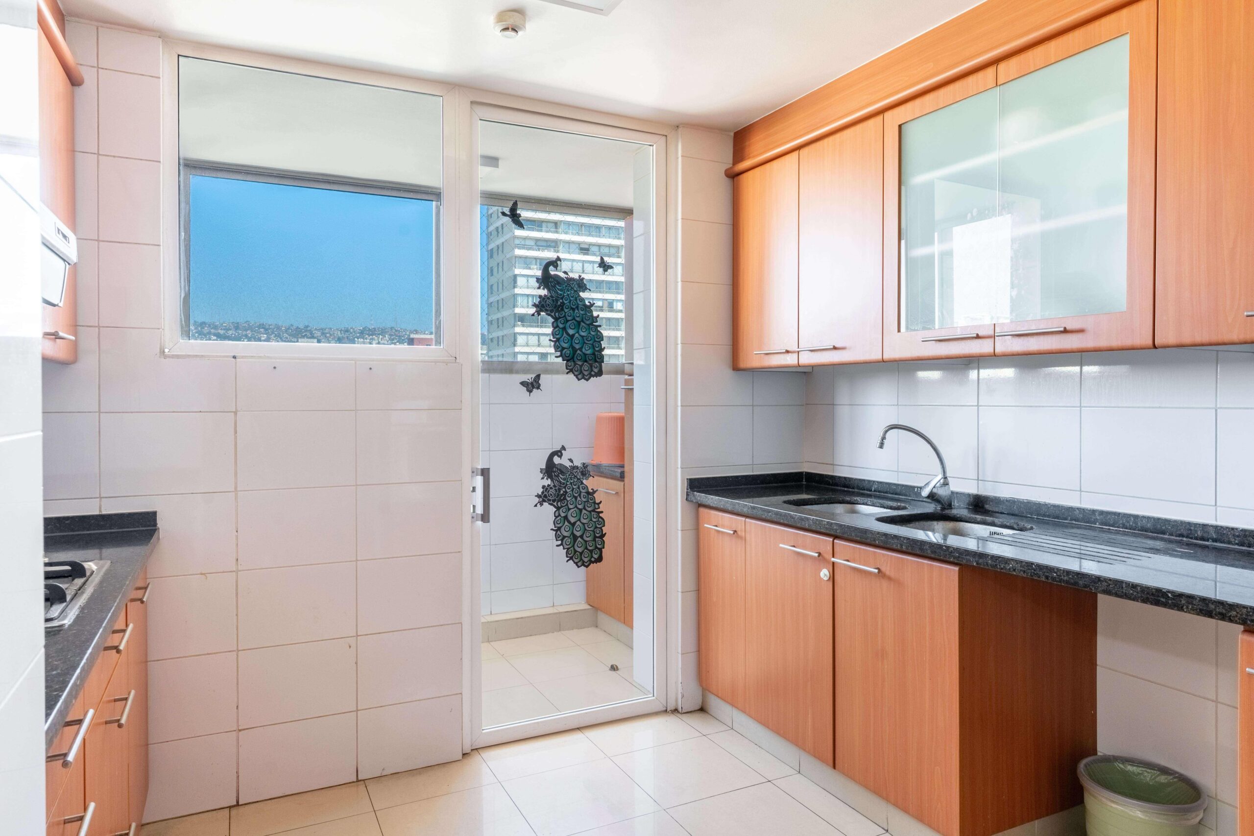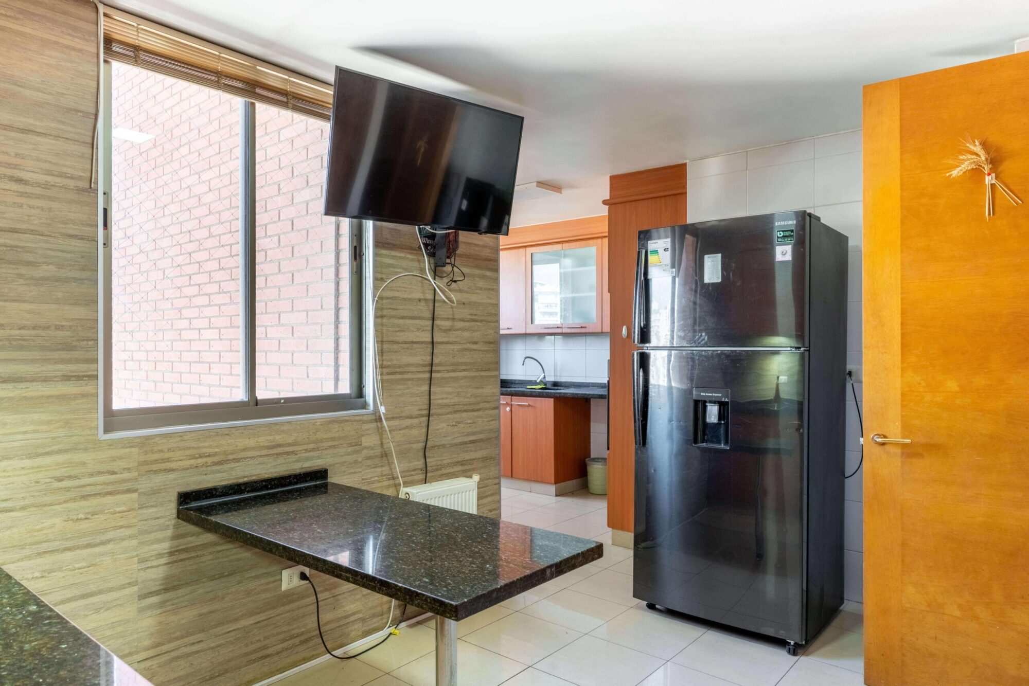 La cocina cuenta con cubierta de mármol y el departamento dispone de 2 estacionamientos y 2 bodegas.